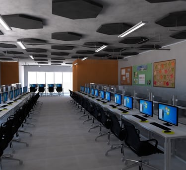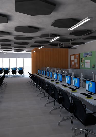 Explore o projeto de um escritório corporativo que foi criado com o intuito de ser um ambiente funcional e uma estética contemporânea com nuvens acústicas.